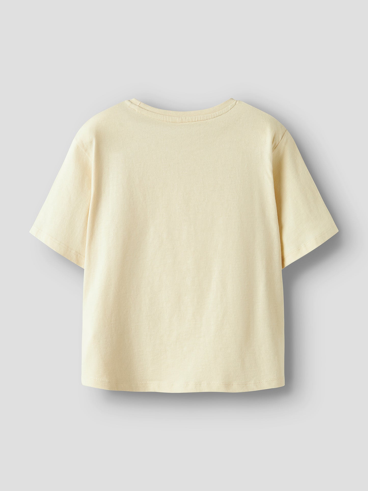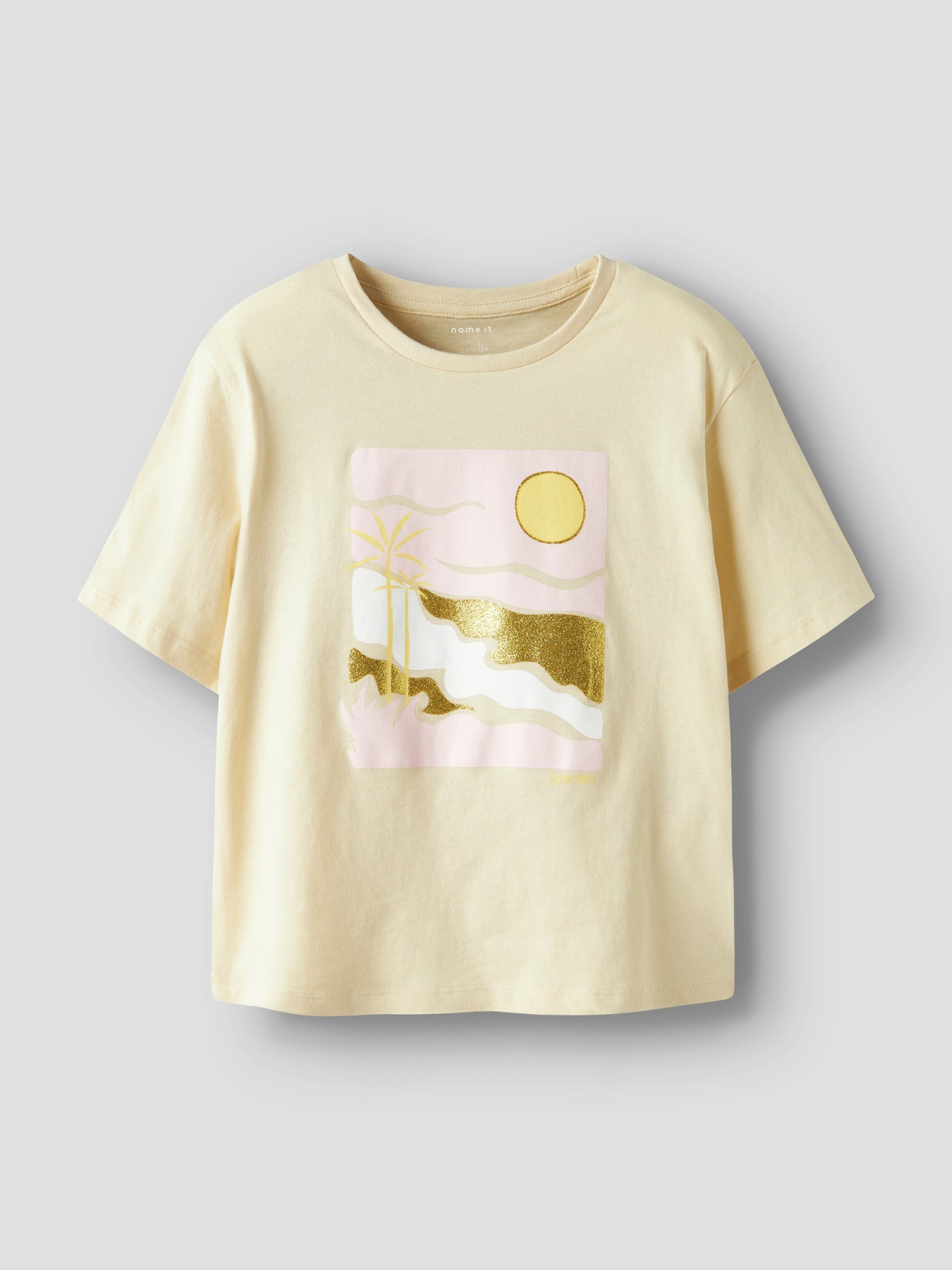 Εφηβική μπλούζα Name it, από μακό ύφασμα. Μονόχρωμη με τύπωμα με γκλίτερ. Λαιμόκοψη. Κοντομάνικη. Από οργανικό βαμβάκι. Κανονική εφαρμογή.