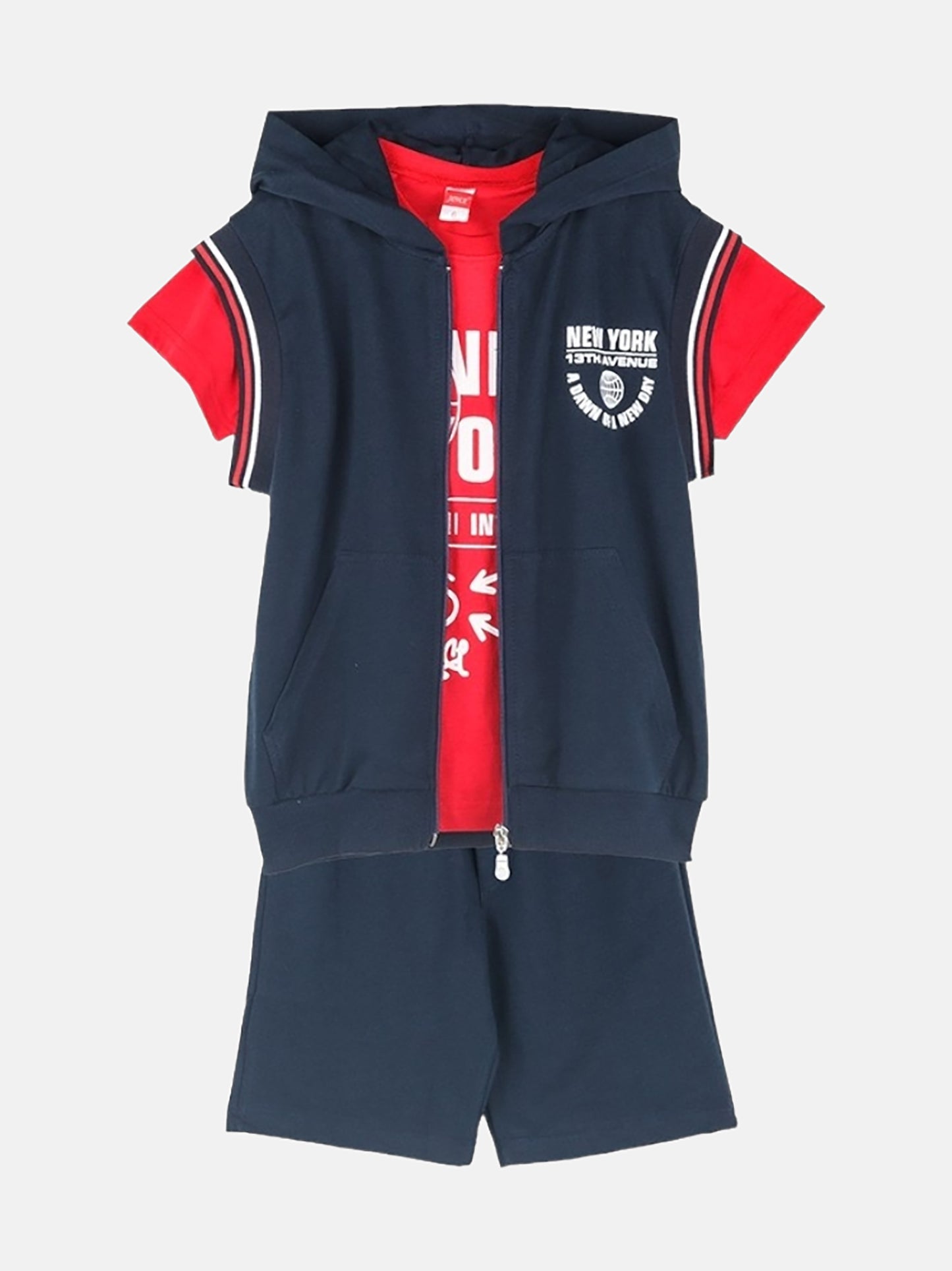 Εφηβικό σετ 3 τεμαχίων Joyce, βαμβακερό. Μπλούζα με τύπωμα. Λαιμόκοψη. Κοντομάνικη. Μακό ύφασμα. Γιλέκο φούτερ με κουκούλα. Τύπωμα εμπρός-πίσω. Αμάνικο. Μάρσιπο τσέπη. Κούμπωμα με φερμουάρ. Βερμούδα φούτερ χωρίς επένδυση. Μονόχρωμη. Πλάγιες τσέπες. Ελληνικής κατασκευής.