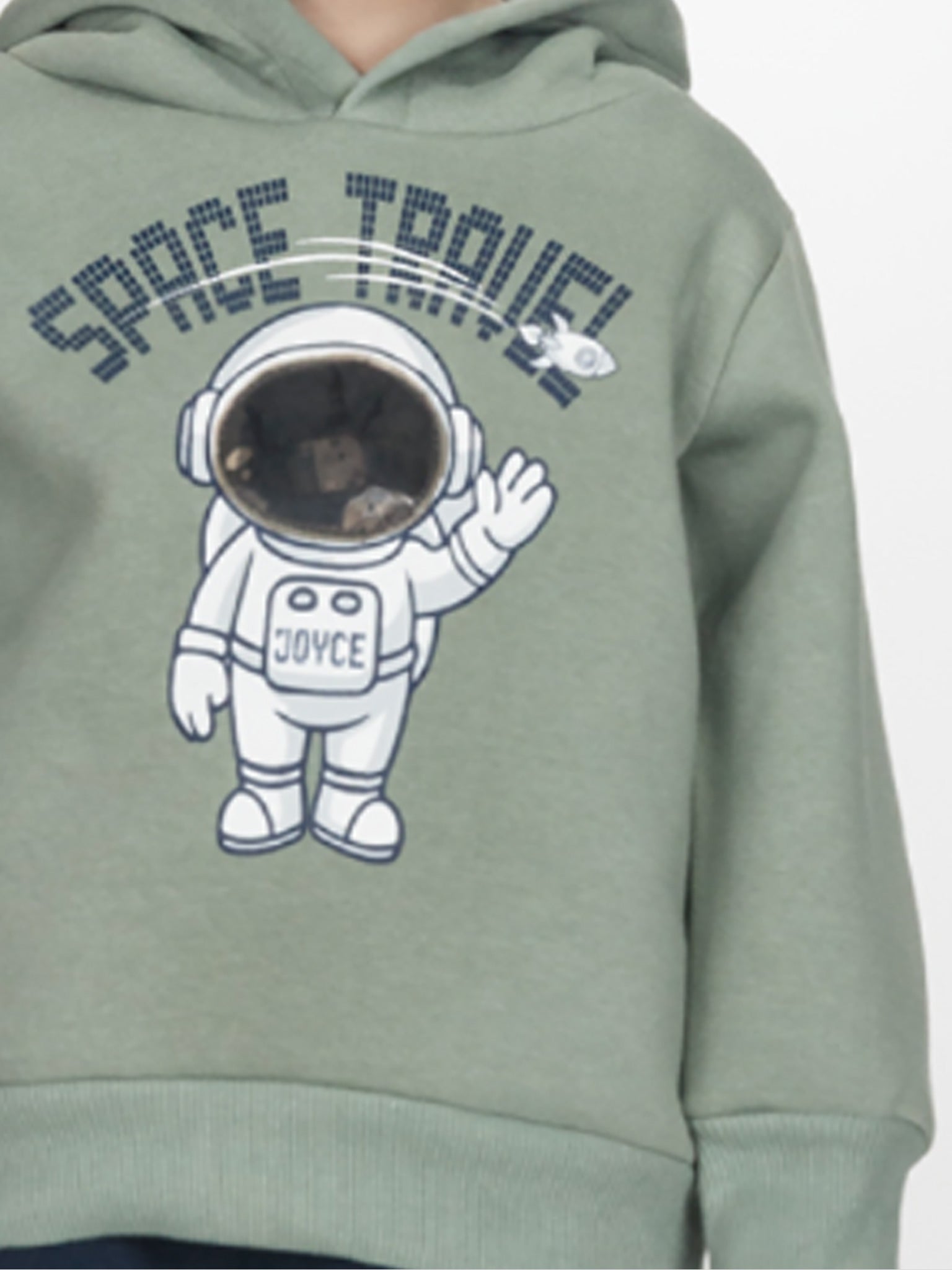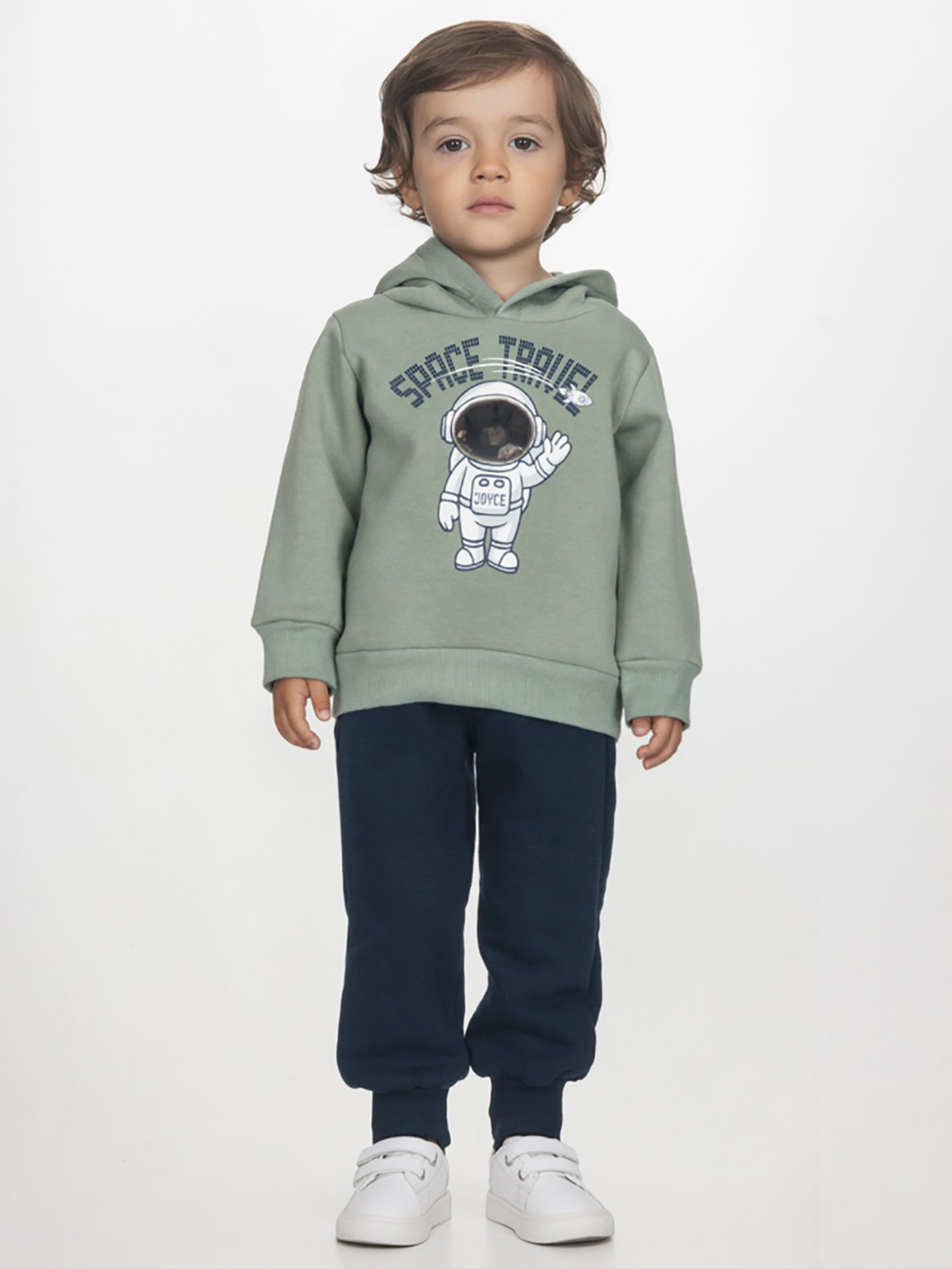 Παιδική φόρμα σετ Joyce, φούτερ με επένδυση χνούδι. Μπλούζα μονόχρωμη με τύπωμα Space travel. Γιακά κουκούλα. Μακρυμάνικη. Παντελόνι φόρμας μονόχρωμο. Λάστιχο στη μέση και ριπ μανσέτα στον αστράγαλο. Ελληνικής κατασκευής.