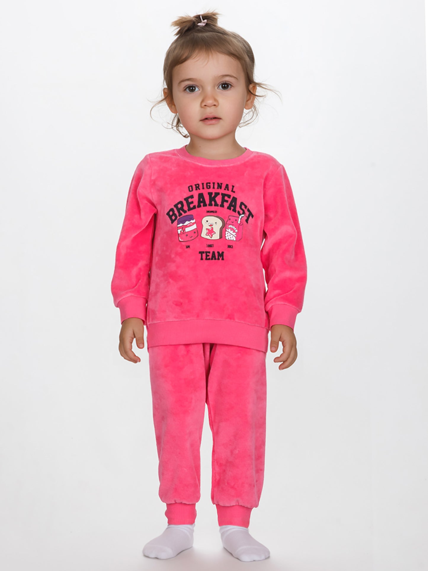 Παιδική πιτζάμα Dreams by Joyce, βελουτέ. Μπλούζα με τύπωμα Breakfast. Λαιμόκοψη. Μακρυμάνικη. Παντελόνι μονόχρωμο. Ελληνικής κατασκευής.